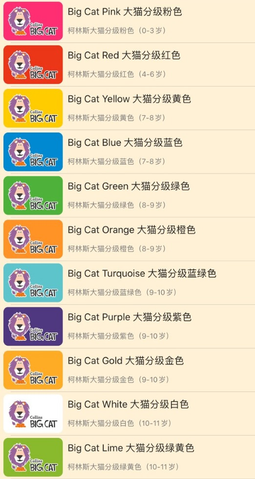 《柯林斯大猫》是英国最畅销的权威分级读物之一,地位与牛津树不相上下,在英美的幼儿园、小学普遍使用,被奉为英国“国民级分级读物”。其内容与英国国家小学教学大纲相呼应,一共7个级别,分级明确,主题丰富。